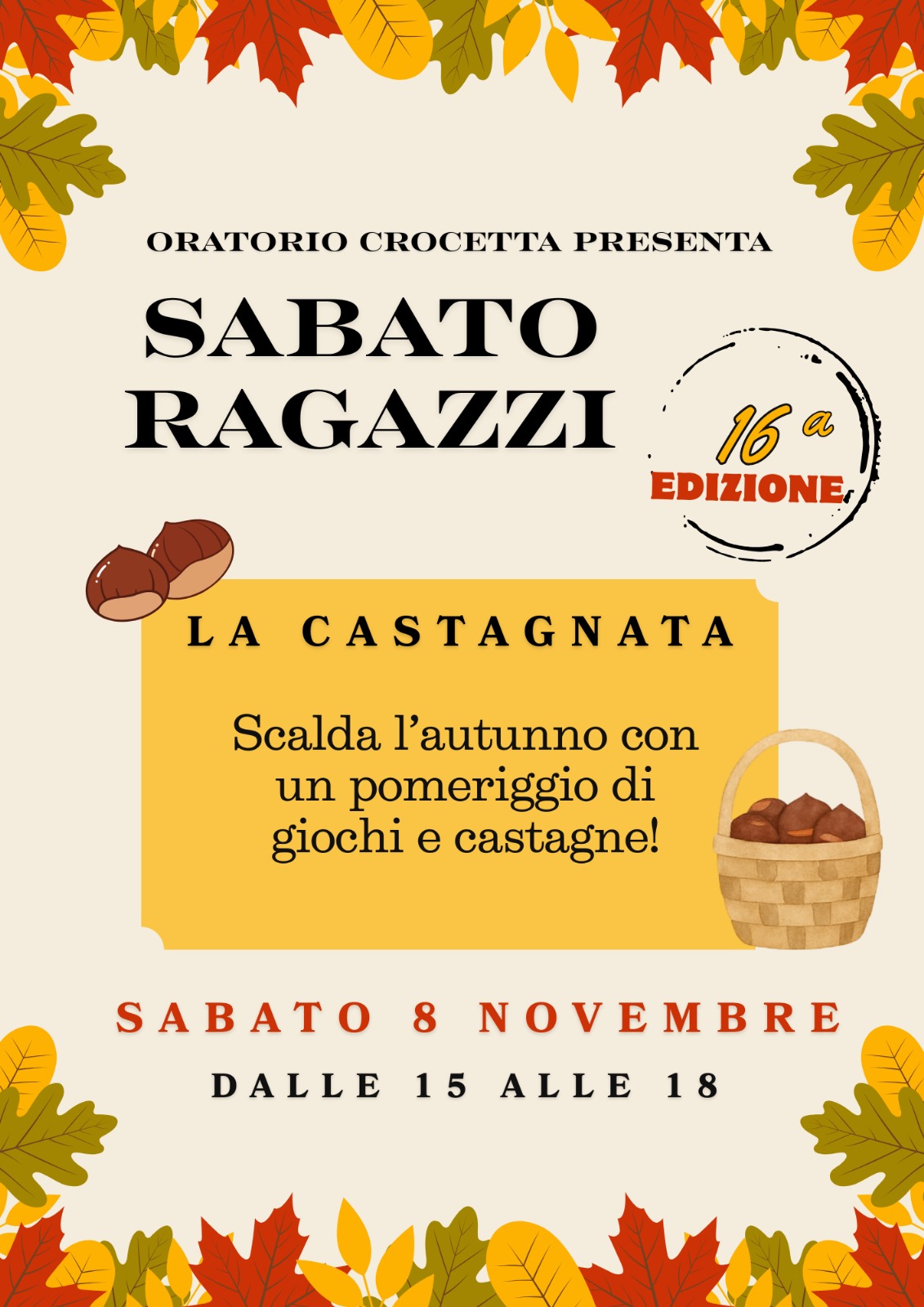 La tradizionale Castagnata dell’Oratorio avrà luogo sabato 8 novembre, con un pomeriggio di giochi e divertimento (dalle 15 alle 18), seguito poi da tante caldarroste!