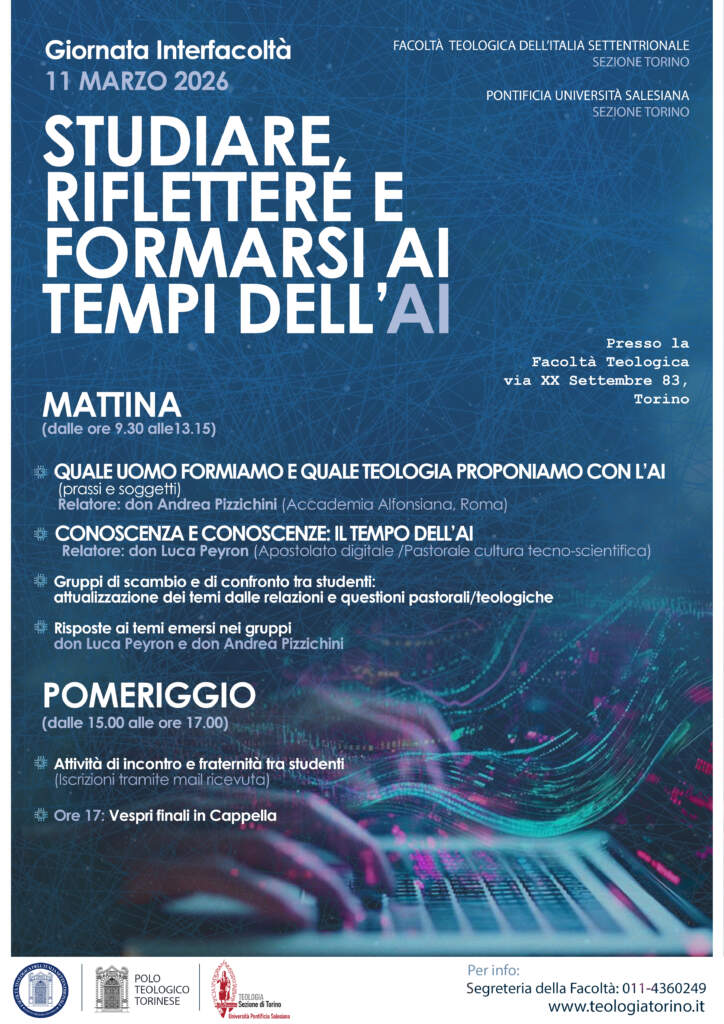 Il giorno 11 marzo 2026 si è svolta la giornata interfacoltà presso la Facoltà Teologica di Torino, in via XX settembre. In questi ultimi anni è diventata sempre più una occasione preziosa per uno scambio umano e culturale tra gli studenti delle facoltà di teologia e scienze religiose presenti nel territorio torinese. Il tema di quest’anno era particolarmente intrigante: Studiare, riflettere, formarsi ai tempi dell’AI. Sicuramente, l’impatto sociale e culturale dell’intelligenza artificiale non può lasciare indifferente chi si occupa di sondare il mistero di Dio, a causa di tutte le implicanze antropologiche legate ai dispositivi AI.