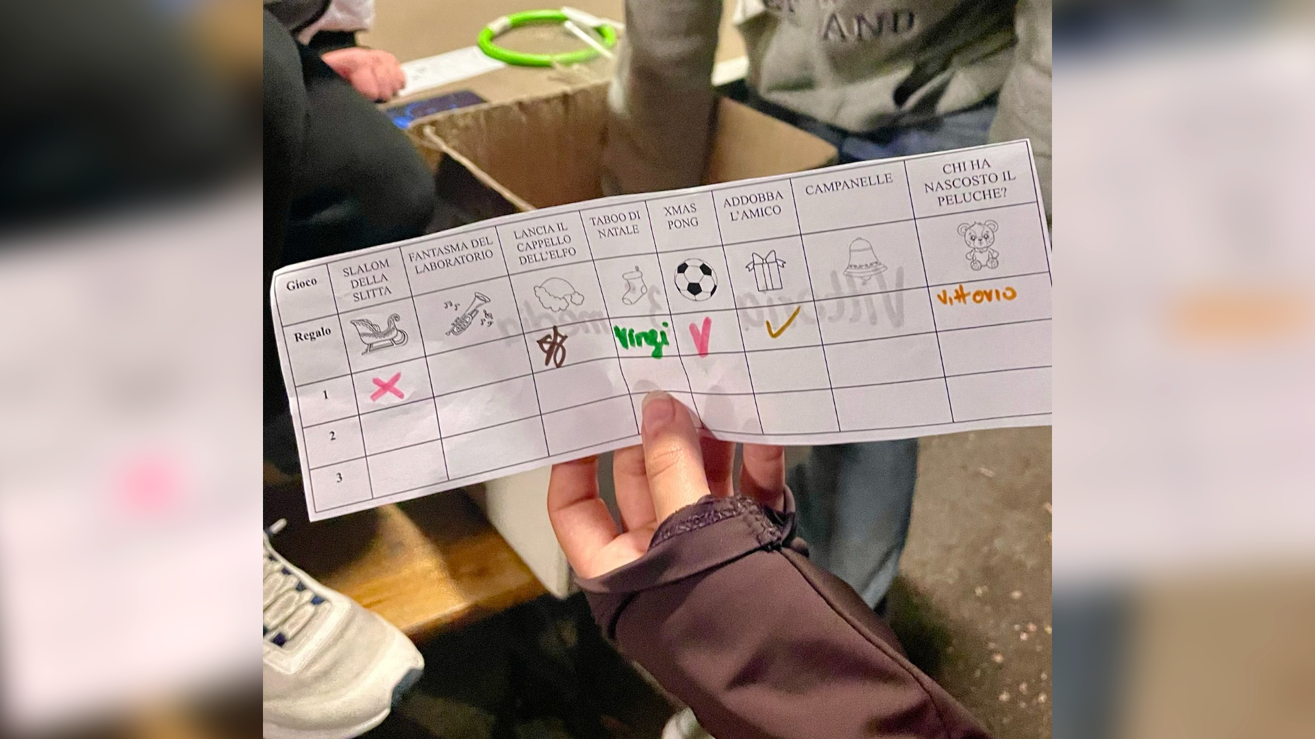 Al loro arrivo, i bambini sono stati radunati e a ciascuno è stato consegnato un biglietto con l’elenco dei giochi da fare. Quando un gioco veniva completato, era compito dell’animatore spuntarlo dalla lista di chi lo aveva superato con successo o – eventualmente – farlo ripetere. I giochi sono risultati adeguati per ciascuno e divertenti, tanto che molti bambini li hanno completati più di una volta! Al termine ci siamo riuniti e sono state premiate due vincitrici. Dopodichè don Giovanni ci ha guidati tutti in un momento di preghiera, l’ultima insieme prima di Natale!