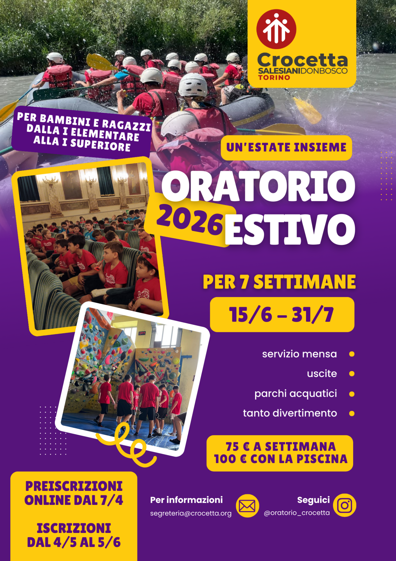 Le preiscrizioni saranno online a partire dal 7 aprile e saranno da formalizzare in Oratorio tra il 4 maggio e il 5 giugno.