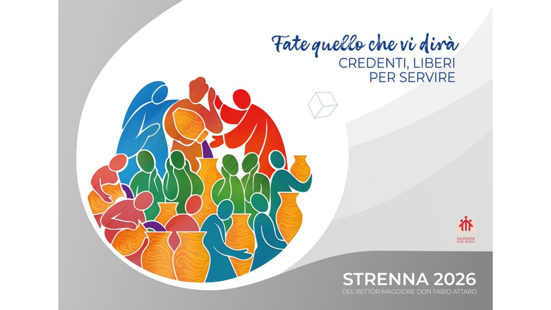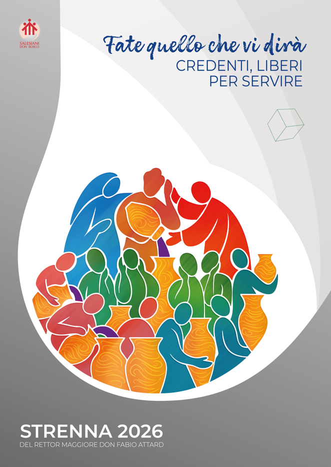 Il Poster della Strenna 2026 dal tema “Fate quello che vi dirà”. Credenti, liberi per servire racconta visivamente il brano del Vangelo delle Nozze di Cana. Riprendendo lo schema in quattro movimenti, proposti dal Rettor Maggiore, vengono evidenziati nell’illustrazione: Maria (a sinistra) che guarda e percepisce il bisogno; rivolge questa consapevolezza a Don Bosco (al centro), che rappresenta il discernimento pieno di fede e l’azione compassionevole della missione salesiana, e insieme guardano a Gesù, che indica la via. In primo piano poi si vedono i servi che ascoltano, scelgono e infine condividono il vino trasformato dalle giare, affinché la comunità riceva l’abbondanza dei doni di Dio. I colori e la disposizione dei soggetti sottolineano la comunione, il servizio e l’attenzione: lo sguardo di Maria risveglia la consapevolezza (guardare), la presenza di Cristo dà profondità e direzione (ascoltare), i gesti liberi e fiduciosi dei servi rivelano il consenso interiore (scegliere) e il loro atto di portare il vino manifesta il servizio gioioso (agire). Nella parte superiore della composizione, il piccolo cubo fluttuante funge da sottile provocazione, un promemoria di come a volte possiamo lasciarci confinare da paure interiori, atteggiamenti rigidi o persino da nuove ideologie e sistemi moderni che promettono progresso ma limitano silenziosamente la nostra apertura allo Spirito e alla vera libertà umana. L’intera immagine è un promemoria del fatto che quando l’amore ascolta la parola di Cristo, il cuore trova la libertà di scegliere, di servire e di condividere la gioia trasformatrice di Dio.